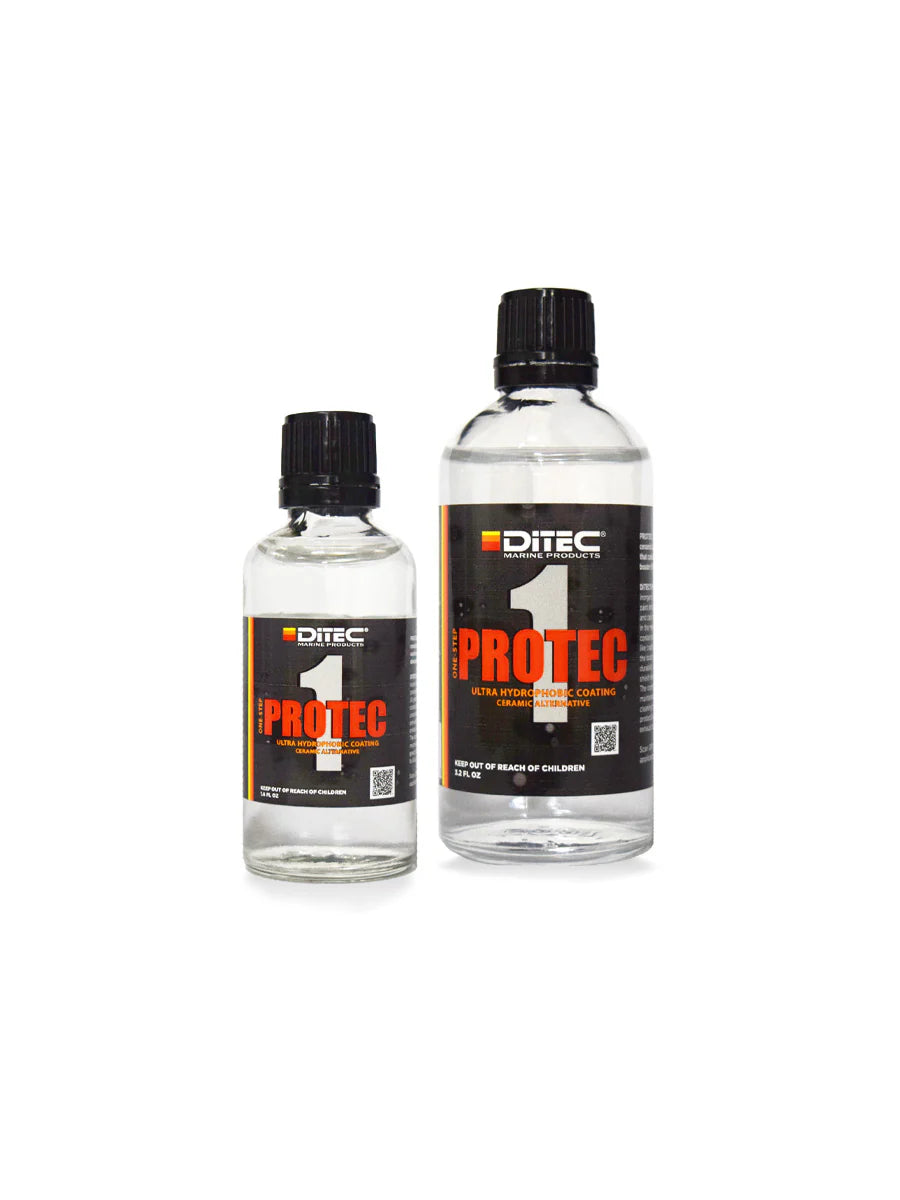 DiTEC’S PROTEC 1 is a one-step, premium, inorganic resin that is better than waxes and sealants for paint and gelcoat surfaces on boats and cars of any size. With almost 50 years in the making, this non-ceramic (does not contain any SiO2) product will not crack like traditional ceramics, but will flex with a paint/gelcoat surface, creating a strong protective shield with great hydrophobic properties. The combination of properties reduces regular cleaning maintenance up to 50%.